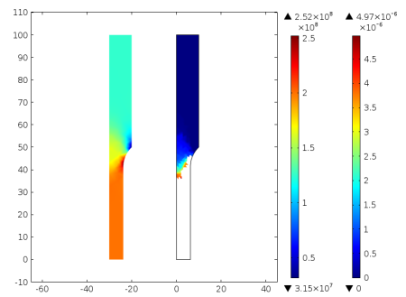 200 MPa are experienced in the thin bottom part of the specimen. As the fatigue usage factor cannot be defined in this part, no results are calculated in this region, as indicated by the missing color contours in the right picture. If a computed stress amplitude exceeds the highest stress amplitude in the S–N curve, a warning stating that fatigue could not be evaluated is displayed.
