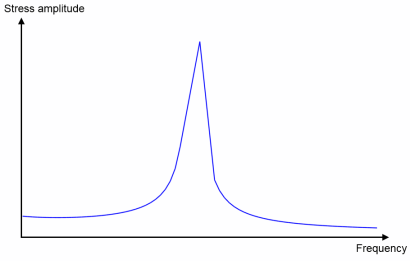 Frequency Domain study, where the stress response is computed at each frequency. A frequency block stretches between two evaluation frequencies and the stress response at the evaluation frequency that gives a higher stress value is used in the computation of the damage. As an example, in the figure below the stress response is computed at 7 frequencies in the
