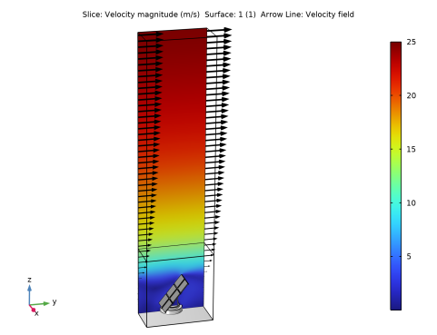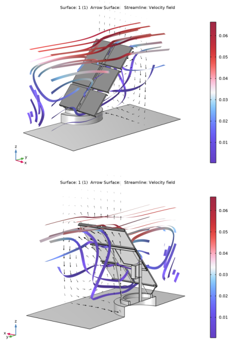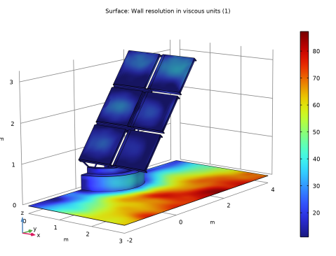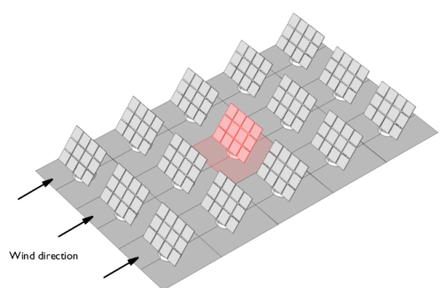 The fluid-flow geometry is defined tall enough to capture a boundary layer type flow reaching above the array of solar panels; see Figure 4. A mapped mesh is used in the solar panels, and the fluid domain is refined to resolve the flow field. The definition of the geometry and the mesh are very important for this model, but they are rather long and complex. They are imported from the MPHBIN-file solar_panel.mphbin included in the model’s Application Libraries folder. This file was obtained from the template MPH-file solar_panel_geom.mph, also included in the model’s Application Libraries folder. The step-by-step instructions for the geometry and mesh can be found in the documentation of the Solar Panel in Periodic Flow Template model.