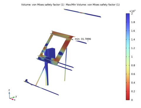 In the Settings window for Volume, click Replace Expression in the upper-right corner of the Expression section. From the menu, choose Component 1 (comp1)>Solid Mechanics>Safety>von Mises>solid.lemm1.sf1.s_f - von Mises safety factor - 1.