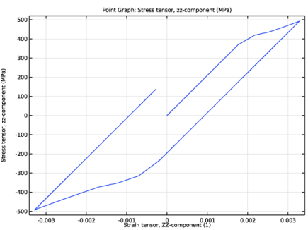 Click Replace Expression in the upper-right corner of the x-Axis Data section. From the menu, choose Component 1 (comp1)>Solid Mechanics>Strain>Strain tensor (material and geometry frames)>solid.eZZ - Strain tensor, ZZ-component.