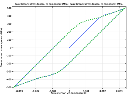 In the Settings window for Point Graph, click Replace Expression in the upper-right corner of the y-Axis Data section. From the menu, choose Component 1 (comp1)>Solid Mechanics>Stress>Stress tensor (spatial frame) - N/m²>solid.sGpzz - Stress tensor, zz-component.