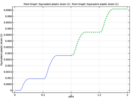 In the Settings window for Point Graph, click Replace Expression in the upper-right corner of the y-Axis Data section. From the menu, choose Component 1 (comp1)>Solid Mechanics>Strain>solid.epeGp - Equivalent plastic strain - 1.