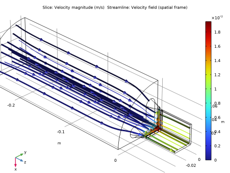 In the Settings window for Streamline, click Replace Expression in the upper-right corner of the Expression section. From the menu, choose Component 1 (comp1)>Laminar Flow>Velocity and pressure>u,v,w - Velocity field (spatial frame).