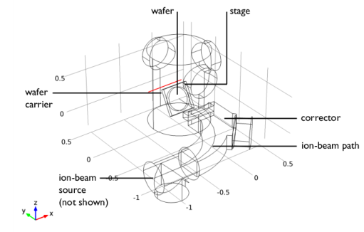 2) is considered: multiple species can be added in the Dependent Variables section the Free Molecular Flow settings window. It is assumed that the outgassing across the wafer surface is uniform and that the total gas emitted is 30 sccm. The vacuum path through the corrector magnetic field enters the main chamber opposite the wafer. The corrector is pumped by a turbomolecular pump on a cylindrical port halfway along the beam path (pump speed: 1500 l/s), and an additional cryopump at the start of the beam path (pump speed: 12,000 l/s). There is an aperture at the entrance to the chamber that reduces the flux entering the corrector. The angle between the wafer outward normal and the ion beam is swept from 0