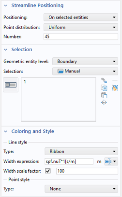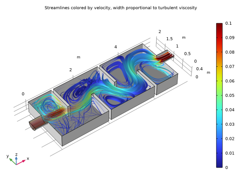 In the Width expression text field, type spf.nuT*1[s/m]. The width of the streamlines is set to the local value of the turbulent viscosity and the factor 1[s/m] is used to get the right dimension.