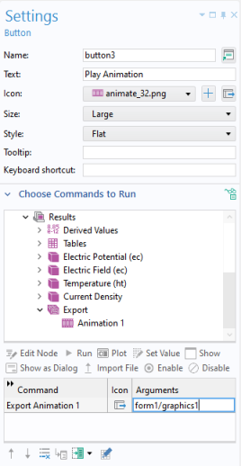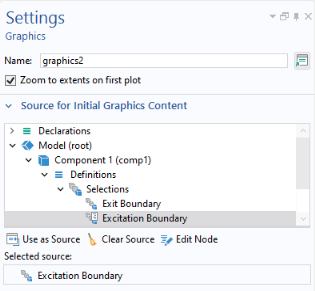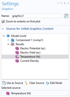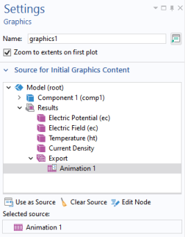 Source for Initial Graphics Content to set the plot group or animation to be displayed as default. To select, click