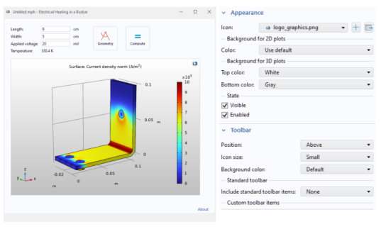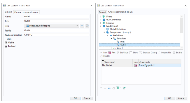 www.comsol.com/model/app-with-cad-import-and-selections-86621. It demonstrates the use of ribbon buttons (items) for interactively selecting inlet and outlet boundaries in a microfluidics model.