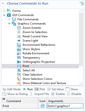 In the editor tree used in a command sequence of, for example, a button, the Graphics Commands folder contains commands to process or modify a graphics object. The figure below shows a command sequence with one command for printing the contents of a graphics object.
