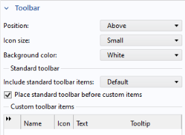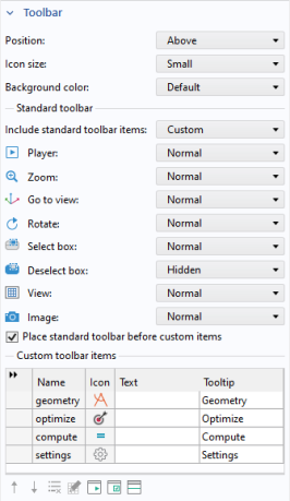 In the Toolbar section, you can also add custom buttons to the graphics toolbar. Use the buttons under the table to add or remove custom toolbar buttons (items). You can also move toolbar buttons up or down, add a