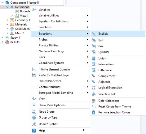 Definitions, or by geometry or mesh sequences, let you group domains, boundaries, edges, or points based on entity number, and the example below illustrates how to work with this type of selection.