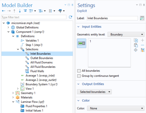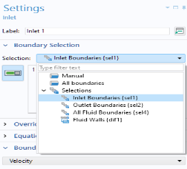 Inlet Boundaries selection is used. In this example, there are also selections for
