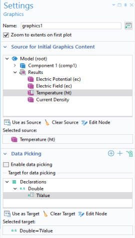Data picking checkbox to make the graphics object interactive so that you can, for example, click on a plot at a particular point and retrieve a numerical value for the temperature at that coordinate. In the figure below, in the section