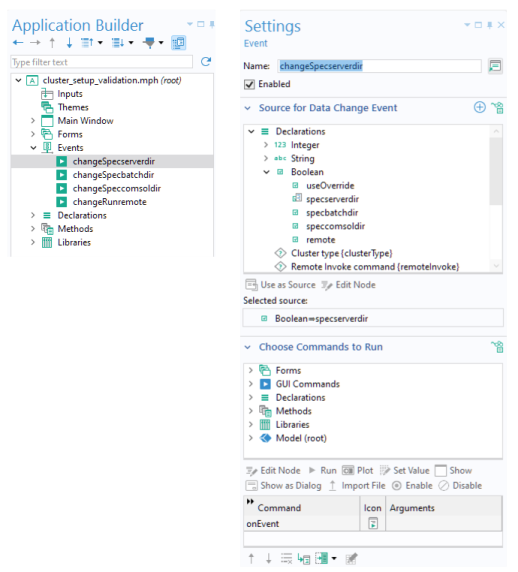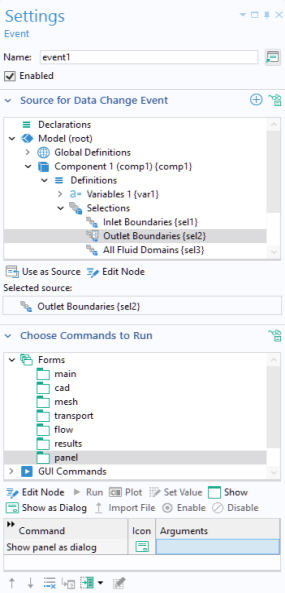 Source for Data Change Event. This allows a command sequence or a method to be run when the user clicks a geometry object, domain, face, edge, or point. The figure below shows a dialog for a global event that opens a form