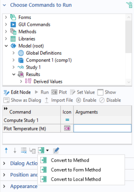 For buttons, ribbons, menus, toolbar items, and global events, you can add a local method by selecting Convert to Local Method from the toolbar menu button under the sequence of commands, as shown in the figure below.