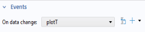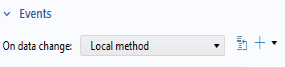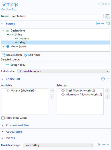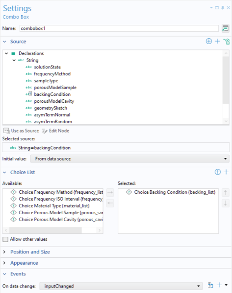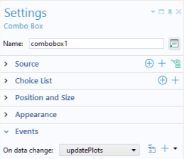 In the Events section, specify a method to run when the value of the combo box, and thereby the string variable used as the source, is changed by the user. In the present case, the value of the variable