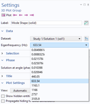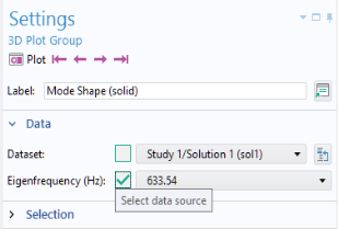 By default, an Eigenfrequency study for structural mechanical analysis creates a Mode Shape plot group. In this plot group, change the Eigenfrequency from mode 7 to mode 8. In the figure below, this corresponds to changing from 440 Hz to 633.52 Hz in the Settings window for the Mode Shape plot group.