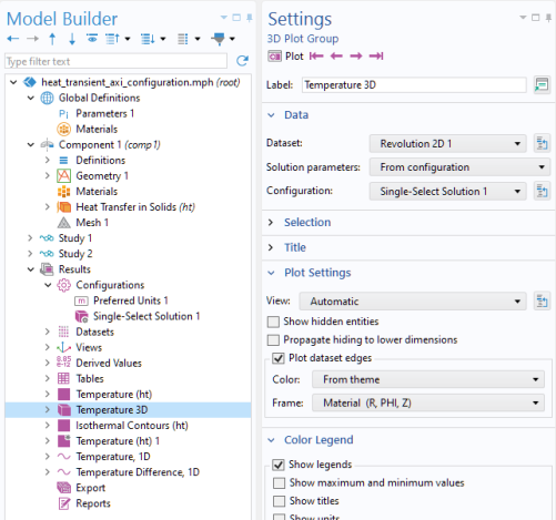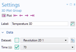 The figure below displays the settings for the Temperature 3D plot group, referencing the