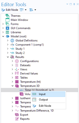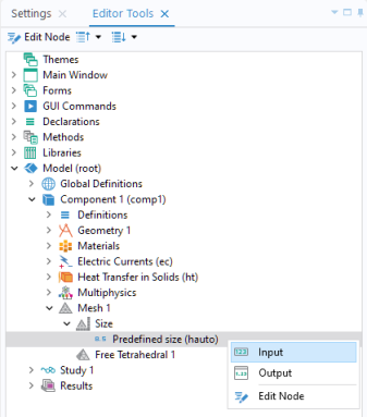 In the Editor Tools window, select the node Predefined size (hauto) under the Mesh > Size node. Then right-click and select Input, as shown in the figure below.