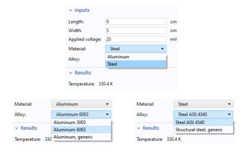 The figure below shows screenshots from an application where the user can choose between two materials, Aluminum or