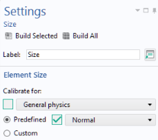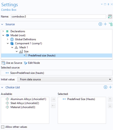 When creating a combo box, you can use the Data Access functionality to reproduce the features of a combo box that exists within the Model Builder. For example, consider an application where a combo box is used to change the element size in a mesh, as in the figure below.
