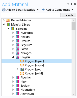 The Material Browser Window. It has the same material libraries available but does not include the detailed properties about each material. The number of material libraries depends on which COMSOL Multiphysics products your license includes. This window is a quick way to add materials to models.