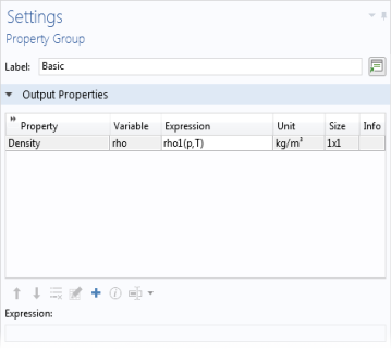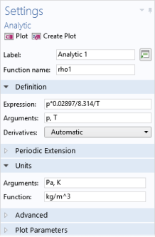 Click the Material node. In the Settings window for Material, under Material Contents, enter rho1(p,T) in the Value column (in the Density row).