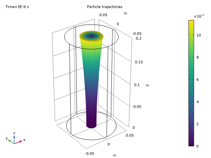 In the Model Builder window, expand the Results > Particle Trajectories (cpt) node, then click Particle Trajectories 1.