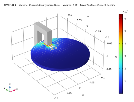 In the Settings window for Arrow Surface, click Replace Expression in the upper-right corner of the Expression section. From the menu, choose Component 1 (comp1) > Magnetic and Electric Fields > Currents and charge > mef.Jx,mef.Jy,mef.Jz - Current density.