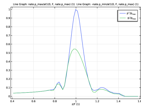In the Settings window for Line Graph, click Replace Expression in the upper-right corner of the y-Axis Data section. From the menu, choose Component 1 (comp1) > Nonlinear Pressure Acoustics, Time Explicit > Pressure and sound pressure level > nate.p_max - Maximum acoustic pressure - Pa.