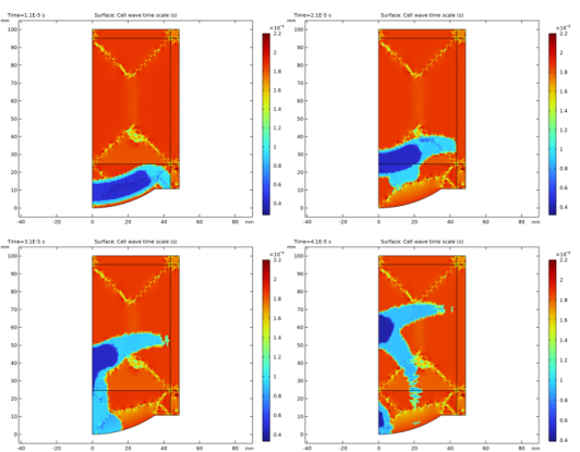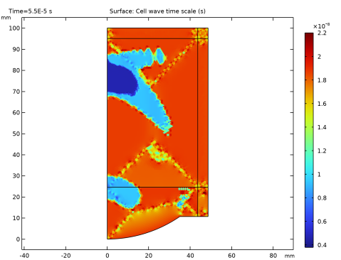 In the Settings window for Surface, click Replace Expression in the upper-right corner of the Expression section. From the menu, choose Component 1 (comp1) > Nonlinear Pressure Acoustics, Time Explicit > Cell time scale > nate.wtc - Cell wave time scale - s.