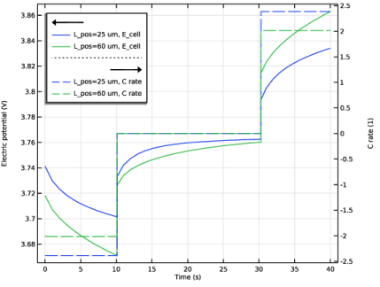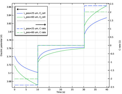 In the Settings window for Global, click Replace Expression in the upper-right corner of the y-Axis Data section. From the menu, choose Component 1 (comp1) > Definitions > Variables > C_rate - C rate - 1.