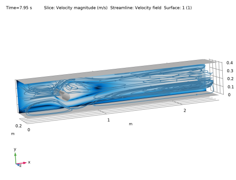 Locate the Data section. From the Time (s) list, choose 7.95. Since the inlet velocity vanishes at the final time step, the solution at t=7.95s is chosen for a better visualization of the streamlines.