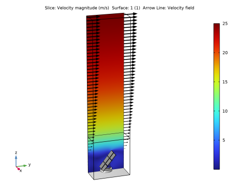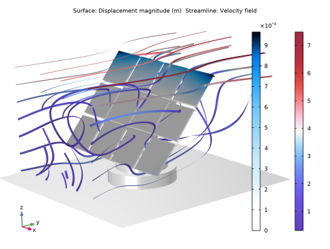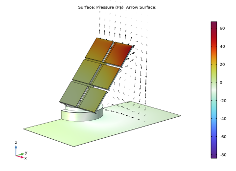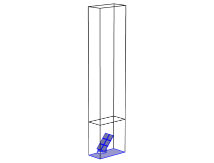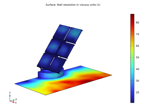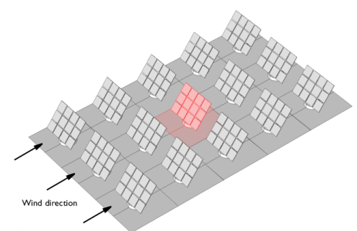 The fluid-flow geometry is defined tall enough to capture a boundary layer type flow reaching above the array of solar panels; see Figure 4. A mapped mesh is used in the solar panels, and the fluid domain is refined to resolve the flow field. The definition of the geometry and the mesh are very important for this model, but they are rather long and complex. They are imported from the MPHBIN-file solar_panel.mphbin included in the model’s Application Libraries folder. This file was obtained from the template MPH-file solar_panel_geom.mph, also included in the model’s Application Libraries folder. The step-by-step instructions for the geometry and mesh can be found in the documentation of the Solar Panel in Periodic Flow Template model.