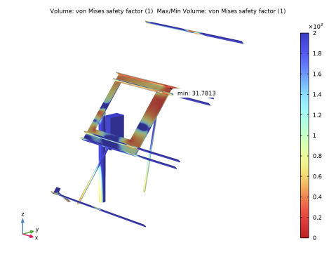 In the Settings window for Max/Min Volume, click Replace Expression in the upper-right corner of the Expression section. From the menu, choose Component 1 (comp1) > Solid Mechanics > Safety > von Mises > solid.lemm1.sf1.s_f - von Mises safety factor - 1.