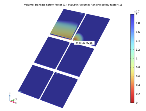 In the Settings window for Max/Min Volume, click Replace Expression in the upper-right corner of the Expression section. From the menu, choose Component 1 (comp1) > Solid Mechanics > Safety > Rankine > solid.lemm1.sf2.s_f - Rankine safety factor - 1.