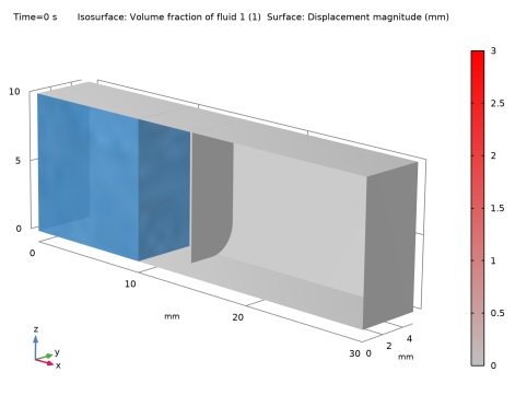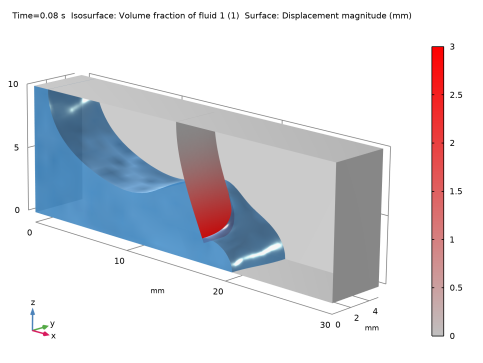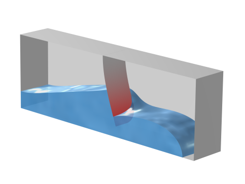 This example implements the model using two predefined multiphysics coupling interfaces: Two-Phase Flow, Phase Field and Fluid–Shell Interaction. These multiphysics couplings add to the model a Laminar Flow interface, which computes the fluid’s velocity and pressure; a Phase Field interface, which computes the volume fraction of the two phases; and a Shell interface, which computes the structural displacement of the obstacle.
