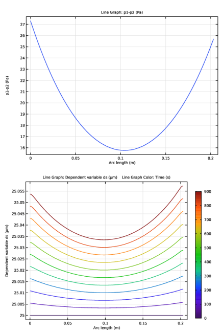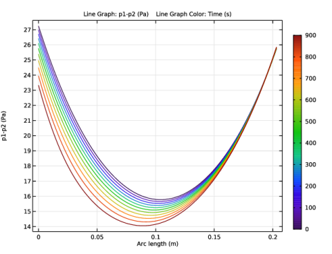 In the Model Builder window, expand the Pressure difference p1-p2, along the centerline 1 node, then click Line Graph 1.