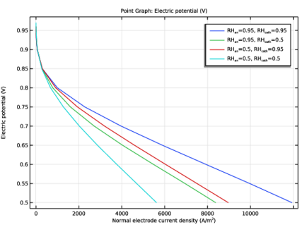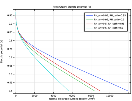 In the Settings window for Point Graph, click Replace Expression in the upper-right corner of the y-Axis Data section. From the menu, choose Component 1 (comp1) > Hydrogen Fuel Cell > fc.phis - Electric potential - V.