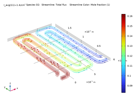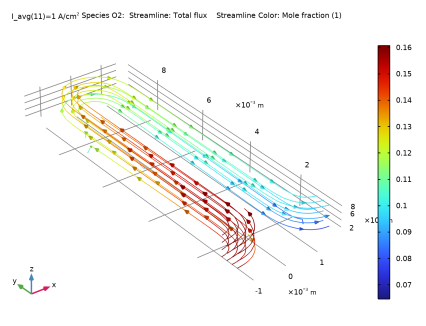 In the Model Builder window, expand the Mole Fraction, O2, Streamline (fc) node, then click Streamline 1.