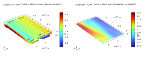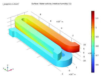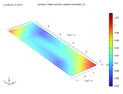 In the Settings window for Surface, click Replace Expression in the upper-right corner of the Expression section. From the menu, choose Component 1 (comp1) > Hydrogen Fuel Cell > Membrane transport > fc.aw_mem - Water activity (relative humidity) - 1.