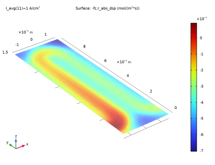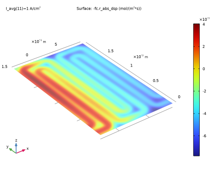 In the Settings window for Surface, click Replace Expression in the upper-right corner of the Expression section. From the menu, choose Component 1 (comp1) > Hydrogen Fuel Cell > fc.nIl - Normal electrolyte current density - A/m².