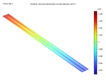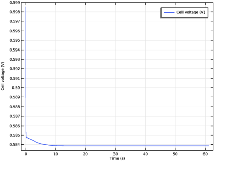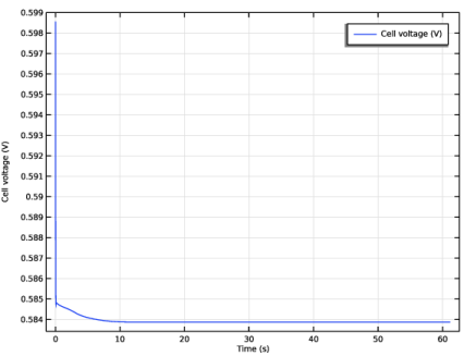 The fourth and final Time Dependent step solves for the fully coupled problem using a time-dependent solver, representing the transient behavior of the cell during 60 s after a current step going from a 0 to 1 A/cm2 average cell current density at t = 0 s.