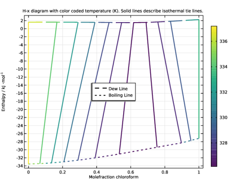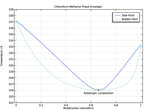 In this model, the phase envelope for a nonideal mixture of chloroform and methanol is studied. This mixture has a constant boiling point known as an azeotrope. Two diagrams will be produced, one temperature-mole fraction (T-x) diagram, and one enthalpy-mole fraction (h-x) diagram. These kind of diagrams are informative, and the latter was traditionally even used to solve distillation calculations graphically in the so called Ponchon–Savarit method. The h-x diagram shape provides information about the energy balances. If the dew and boiling lines are straight and parallel, the heat of vaporization is constant in terms of composition, which historically allowed for the more simplified McCabe–Thiele method to be used.
