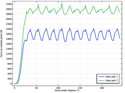 The contact force on a Gear Pair is computed using Weak constraints or Penalty method. By default, the contact force computation is turned off. Use the weak constraints method for more accurate contact forces. However, you preferably opt for the penalty method for large rigid body systems.