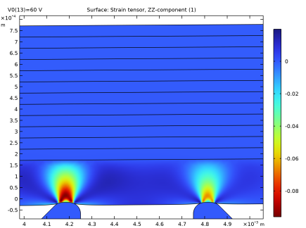 In the Settings window for Surface, click Replace Expression in the upper-right corner of the Expression section. From the menu, choose Component 1 (comp1) > Solid Mechanics > Strain > Strain tensor (material and geometry frames) > solid.eZZ - Strain tensor, ZZ-component.