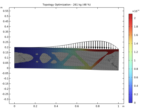 Locate the Title section. In the Title text area, type Topology Optimization - eval(mass1.mass) kg (eval(mass1.mass/M0*100,,%d) %).