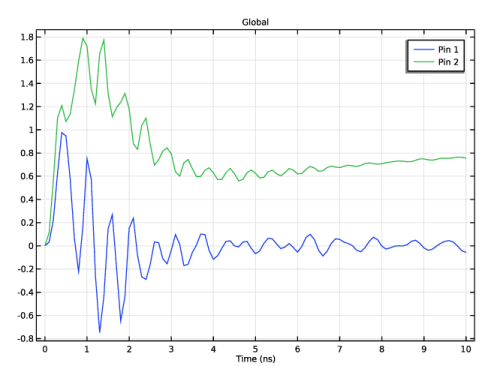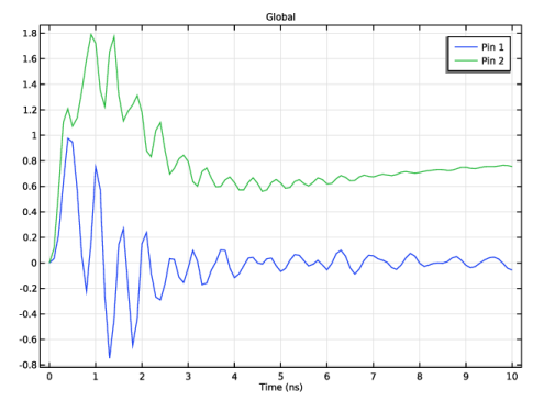 In the Settings window for Global, click Add Expression in the upper-right corner of the y-Axis Data section. From the menu, choose Component 1 (comp1) > Electromagnetic Waves, Transient > Lumped elements > Voltage > temw.Velement_1 - Lumped element 1 voltage - V.