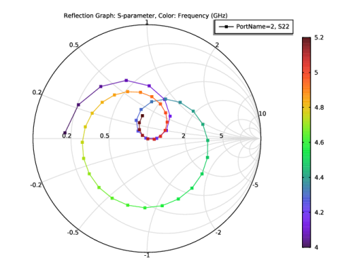 In the Settings window for Reflection Graph, click Replace Expression in the upper-right corner of the Expression section. From the menu, choose Component 1 (comp1) > Electromagnetic Waves, Frequency Domain > Ports > S-parameter > emw.S22 - S22.