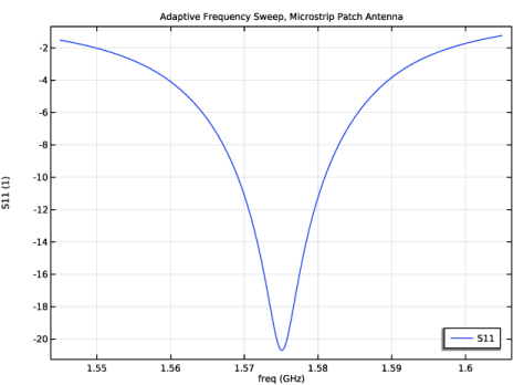 In the Settings window for Global, click Add Expression in the upper-right corner of the y-Axis Data section. From the menu, choose Component 1 (comp1) > Electromagnetic Waves, Frequency Domain > Ports > emw.S11dB - S11 - 1.